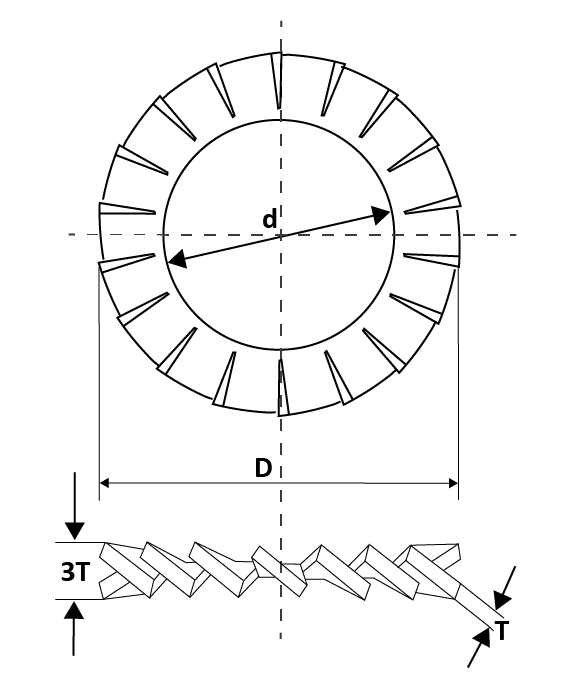 1. Brickans kropp är skårad på utsidan och varje utskuren del är sedan vriden och utgör en del av av brickans fjädring som konstant belastar förbandet och försvårar rörelser på mutter eller skruvskalle.
